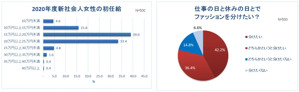 新卒女子約8割“仕事と休日の服装は別” スーツ・オフィスカジュアルの人ほど、プライベートの服を楽しみたい!? 社会人デビュー!6割以上は「新しいファッションに挑戦」 初任給「15~20万円」が最多!ファッション予算は「1~2万円」