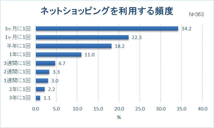 また、ネットショッピングの利用状況を調査すると、7割以上の女性が「(3年に1回以上)ネットショッピングを利用する」(72.6%)と回答し、最も多い利用頻度は「3ヶ月に1回」(34.2%)ということが明らかになりました。