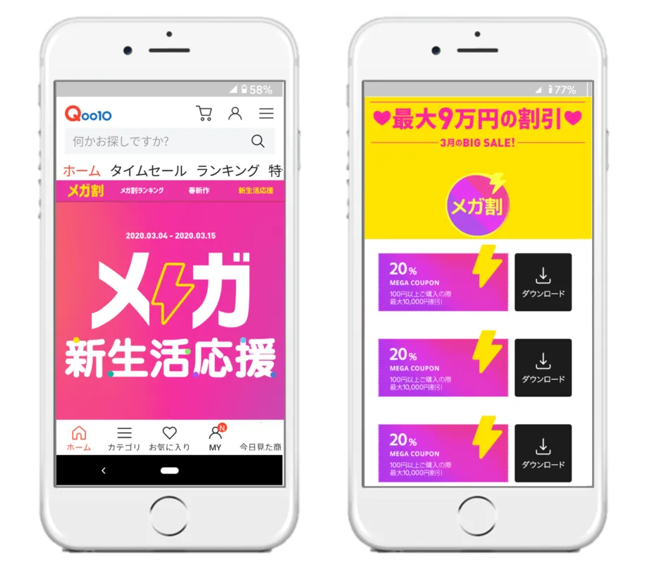 新生活応援Qoo10「20%メガ割セール」を、2020年3月4日(水)から3月15日(日)まで開催しています。セールでは、開催期間を3月4日~7日、3月8日~11日、3月12日~15日の3つにわけて、1期間につき20%メガ割クーポン(最大1万円分の割引)を3枚、期間中に合計9枚(最大9万円分の割引)発行しています。