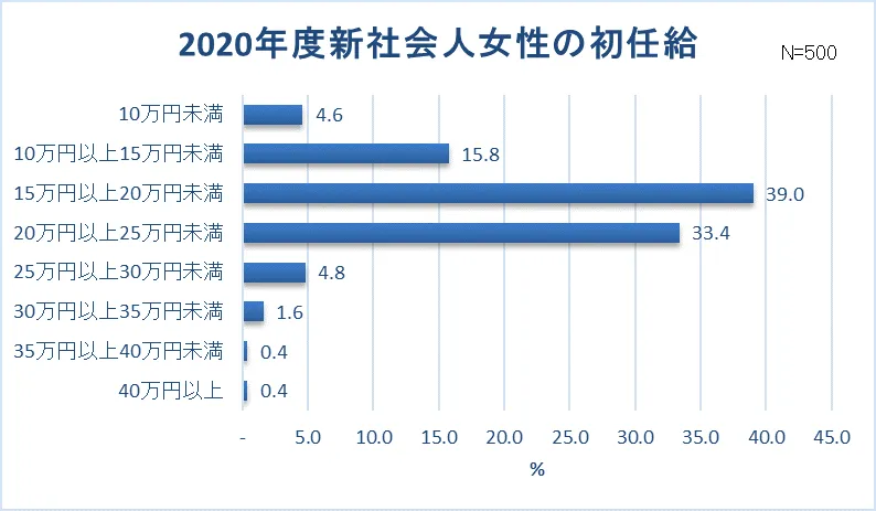 1.2020年新社会人女性の初任給は「15万円以上20万円未満」(39.0%)が最多