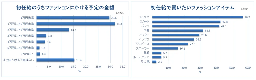 次に、初任給のうちファッションにかける金額について調査すると、「1万円以上2万円以下」(31.8%)という回答が最も多い結果に。その後には「1万円未満」(29.6%)、「お金をかける予定はない」(15.4%)という回答が続き、全体的に堅実な印象となりました。具体的に買いたいアイテムとしては、「トップス」(56.7%)、「スカート」(42.8%)、「パンツ」(42.1%)をはじめとする定番アイテムに票が集まりました。その他には、定期的に買い替える「下着」(31.9%)や仕事でもプライベートでも活躍する「パンプス」(26.2%)にも一定数の票が集まりました。