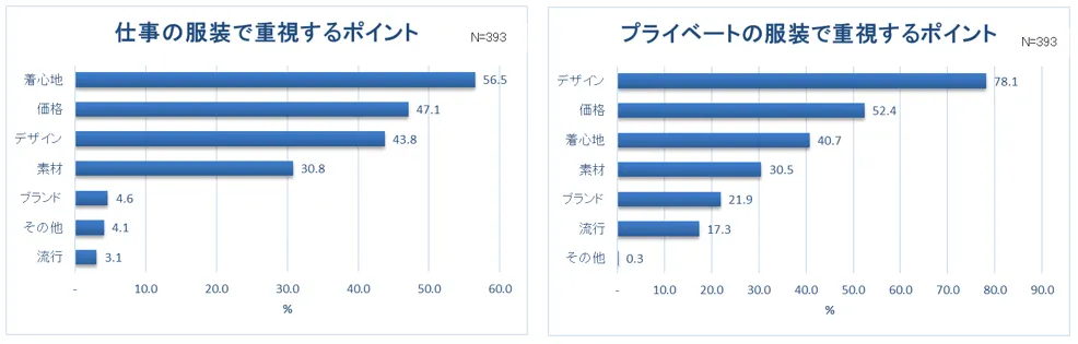 5.仕事の服装で重視するのは「着心地」(56.5%)一方、プライベートの服装は「デザイン」(78.1%)重視