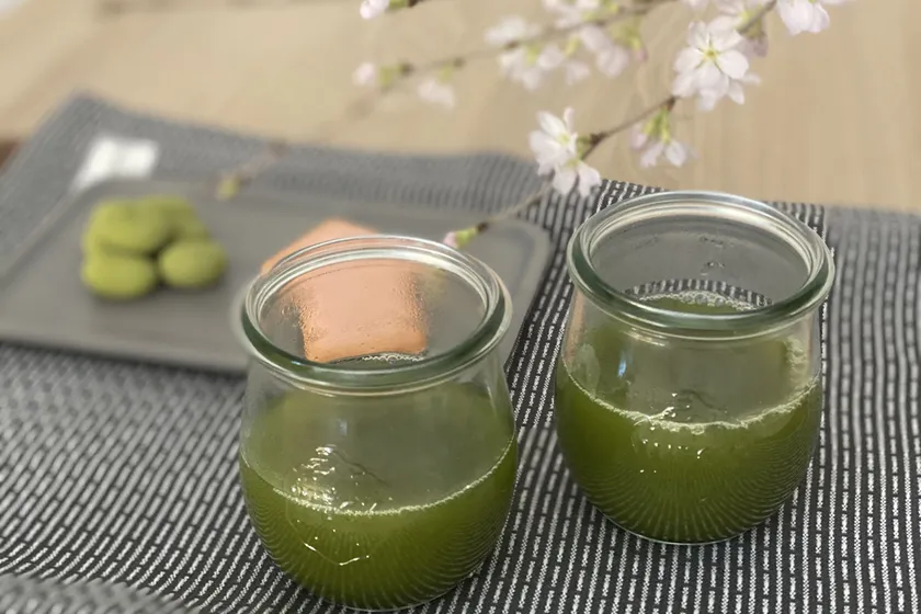 ほのかに香りが広がる、繊細な風味の桜の葉がブレンドされた抹茶のセット。小さじ1弱(3g)に250mlのお湯を加えて、ダマにならないようによくかき混ぜてください。お茶の美しいグリーンを表現したパッケージに仕上げました。