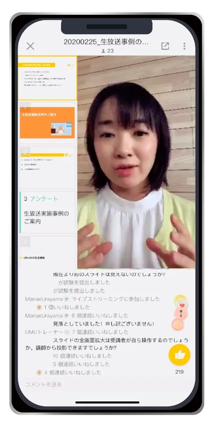 ・UMUの「アンケート」「試験」「抽選」等を生放送中に行ない、その結果をリアルタイムで生放送画面上に表示できるため、双方向性のある配信にできます。