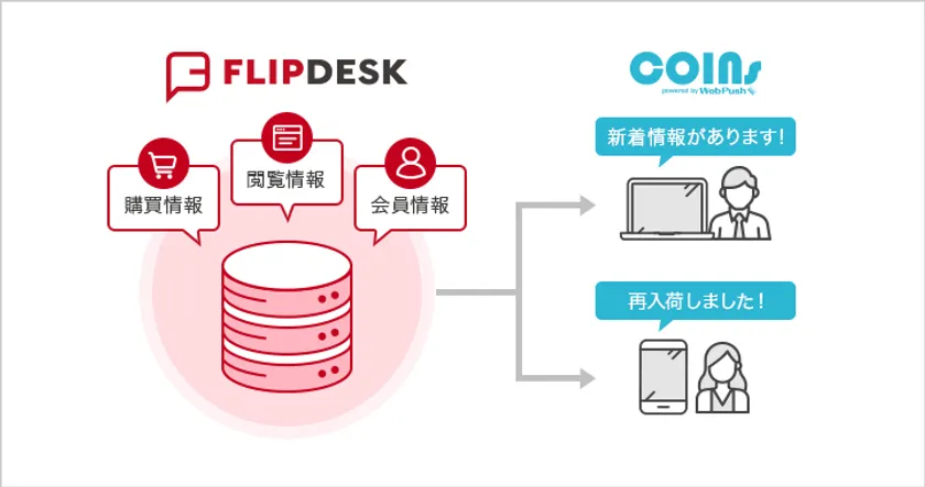 この度の連携により、「Flipdesk」がサイト上で取得したデータを「COINs」に渡すことで、ユーザーに合わせたブラウザ通知を配信することが可能になりました。