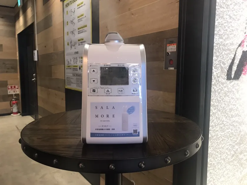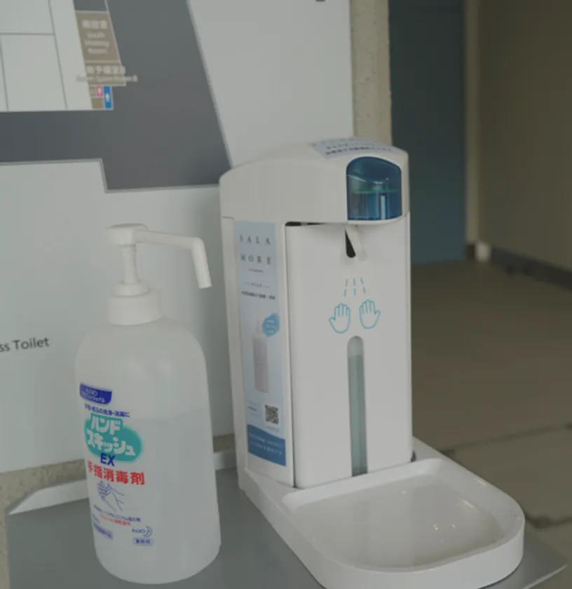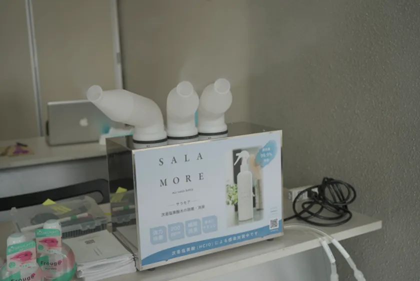 エントランスに設置した超音波噴霧器にて空間除菌を行い、手指殺菌のハンドディスペンサーも設置し体表面除菌。机・椅子・ドアノブ・手すりなどの物体除菌をスタッフにより徹底。