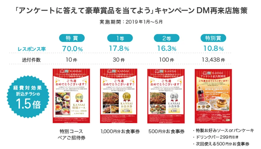 これらのDM施策は、チラシと比べて1.5倍の経費対効果となりました。