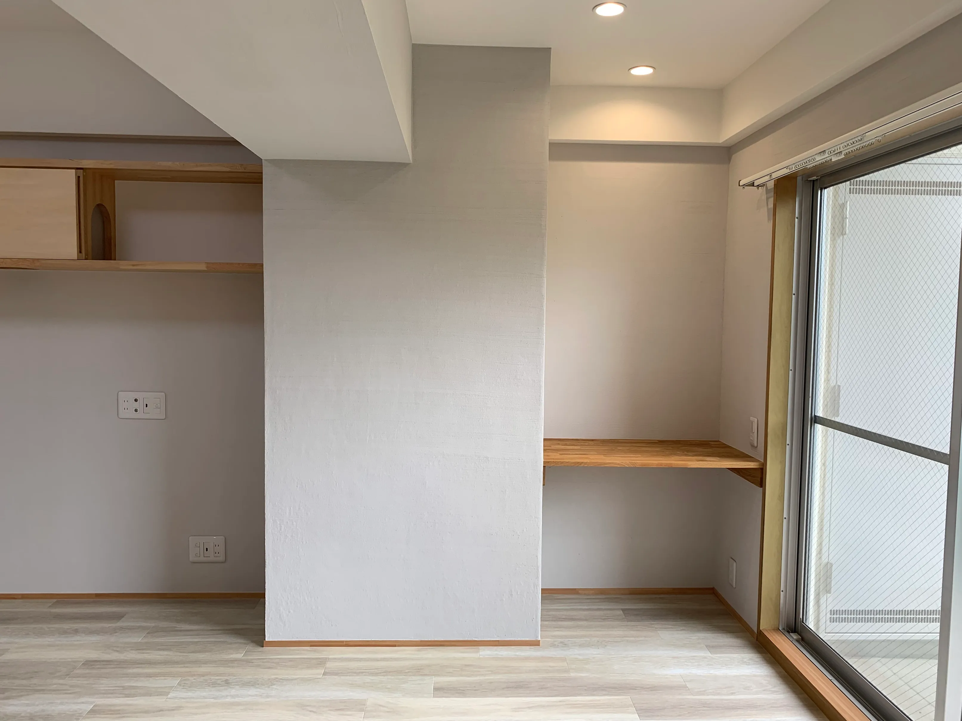 マンションの構造の柱をあえて利用して、窓際にワークスペースを作りました。両サイドを壁にすることで、リビングにいながらもこもり感があり集中できるスペースにしています。