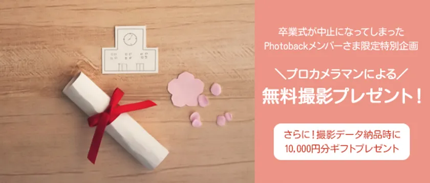 現在、卒業式・入学式の中止により、一生に一度の大切な思い出を作る機会が失われています。我々は「お客様の大切な思い出を残し、感謝を創り出すこと」をミッションとするサービスとして、皆様の思い出づくりを支援したいという想いから、この度、当社とつながりのあるプロカメラマンを派遣し撮影を行い、それをPhotobackでカタチにできるようPhotobackギフト券1万円分を贈呈する体制を整え、ご提供させていただくことになりました。皆様の体調や状況は様々かと思いますが、今我々にできることで皆様の力になりたいと思います。