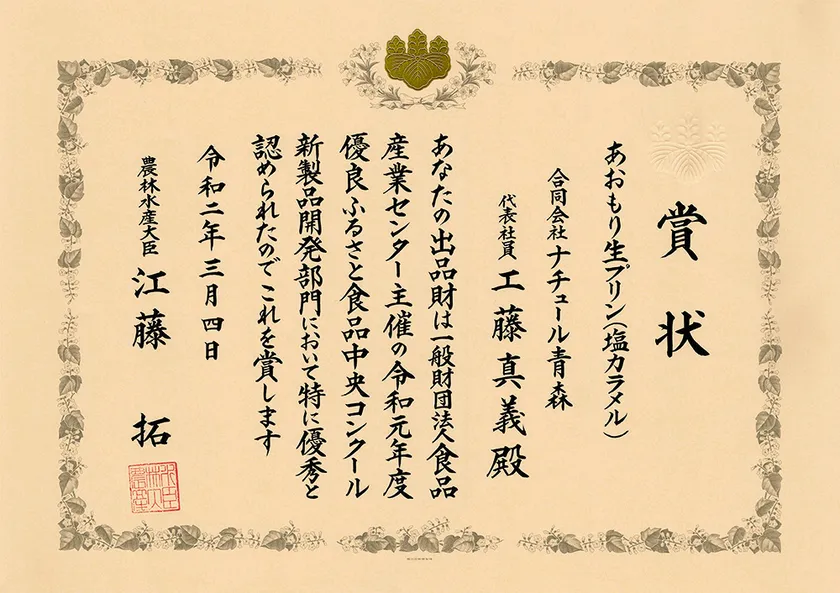 合同会社ナチュール青森(本社:青森県青森市、代表社員:工藤 真義、以下 ナチュール青森)が製造販売する、地元青森県の厳選食材を使用した「あおもり生プリン(塩カラメル)」が、令和2年3月4日、一般財団法人食品産業センターが主催する令和元年度優良ふるさと食品中央コンクールで新製品開発部門において農林水産大臣賞(グランプリ)を受賞しました。