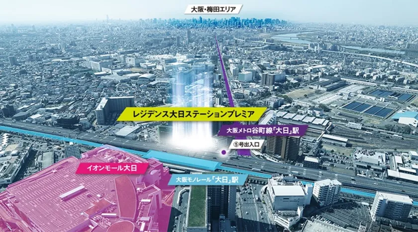 本物件は、大阪メトロ谷町線の始発「大日」駅から徒歩1分の立地に誕生する定期借地権(期間80年)付分譲マンションです。「東梅田」駅まで直通で18分、「新大阪」駅まで21分、「なんば」駅まで27分と市内主要駅へのアクセスが良好で、さらには、大阪モノレール「大日」駅から「大阪空港」駅まで直通で35分のため、出張や旅行にも便利です。また、ファッション、雑貨、グルメ、各種サービスを提供する専門店が180店以上も揃う商業施設「イオンモール大日」まで徒歩3分、マンション周辺には教育機関や医療機関も充実し、生活利便性にも優れるマンションです。