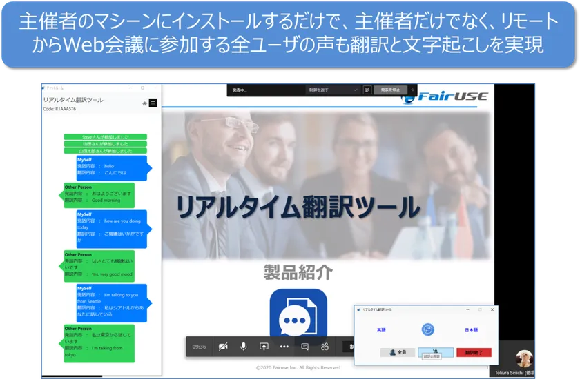 自身の発話内容のみならず、Web会議におけるリモートの参加者の発話内容をそれぞれリアルタイムに翻訳・文字起こしを行います。インストールが必要なのは会議主催者の一台のPCのみになります。Microsoft Teams、Skype for Business、Zoom、Cisco Webex などの様々なWeb会議プラットフォームで利用できます。