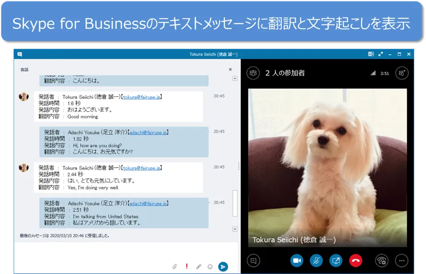 Skype for Business Online、Serverの会議通話時に翻訳および文字起こし内容をテキストメッセージとして表示・送信します。Skype for Business Clientにアドオンするタイプのエディションになります。