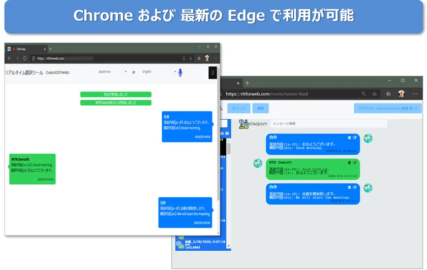 Chrome、Chromium Edgeで当社サービスURLにアクセスすることで利用可能なエディションです。Microsoft Teams、Skype for Business、Zoom、Cisco Webex などの様々なWeb会議プラットフォームにて動作が可能です。過去の会話の履歴も参照可能です。