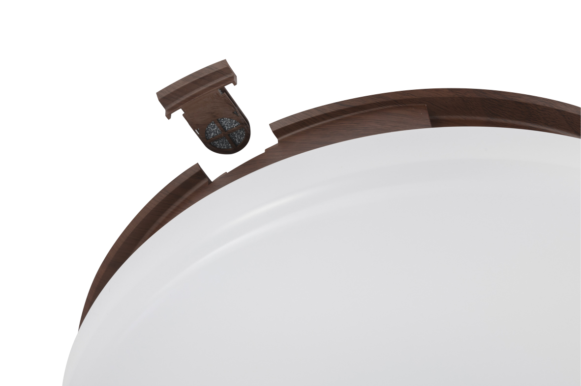 複雑な形状でも水圧が均一に掛かる為、2次曲面だけでなく、3次曲面へ転写ができました。UZUKAZEの形状は円形で凹凸もあり複雑でしたので最適の加工法でした。木目の転写を何度も繰り返しインテリアに似合うベストな木目に仕上がりました。