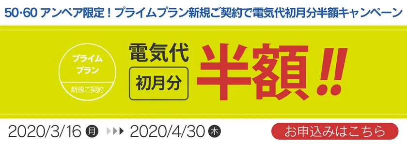 プライムプランのためのプレミアムキャンペーン! 新規お申込みで電気代初月分半額