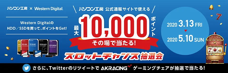 株式会社ユニットコム(代表取締役:端田 泰三、本社:大阪市浪速区)は、パソコン工房とウエスタンデジタル(以下、WD)のコラボ企画”その場で当たるスロットチャンス抽選会”を2020年3月13日(金)より開催します。