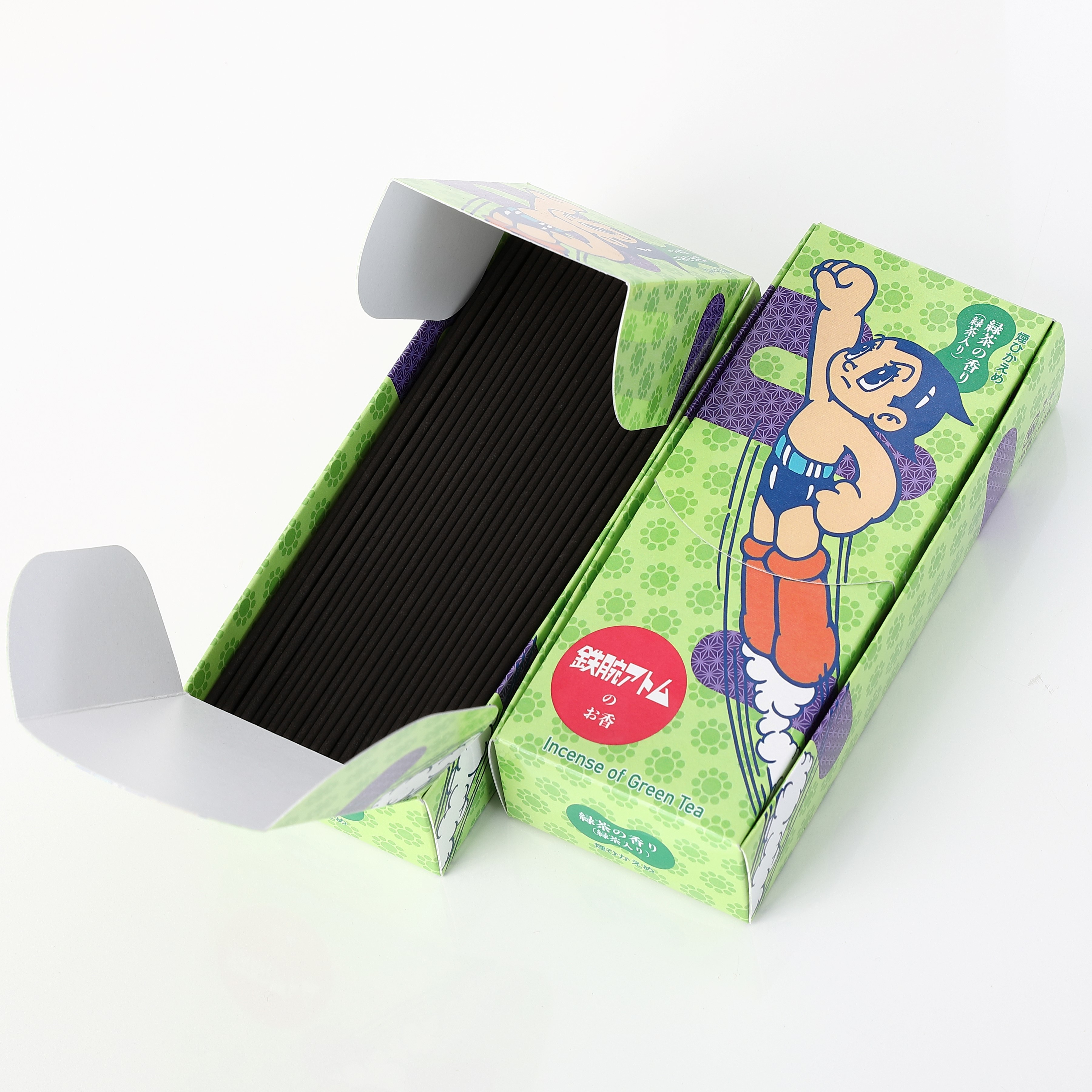 「鉄腕アトムのお香」は作品の日本らしさと爽やかさを緑茶の香りで表現しました。緑茶の成分配合で、消臭効果とリラックス効果が期待できるようになっています。