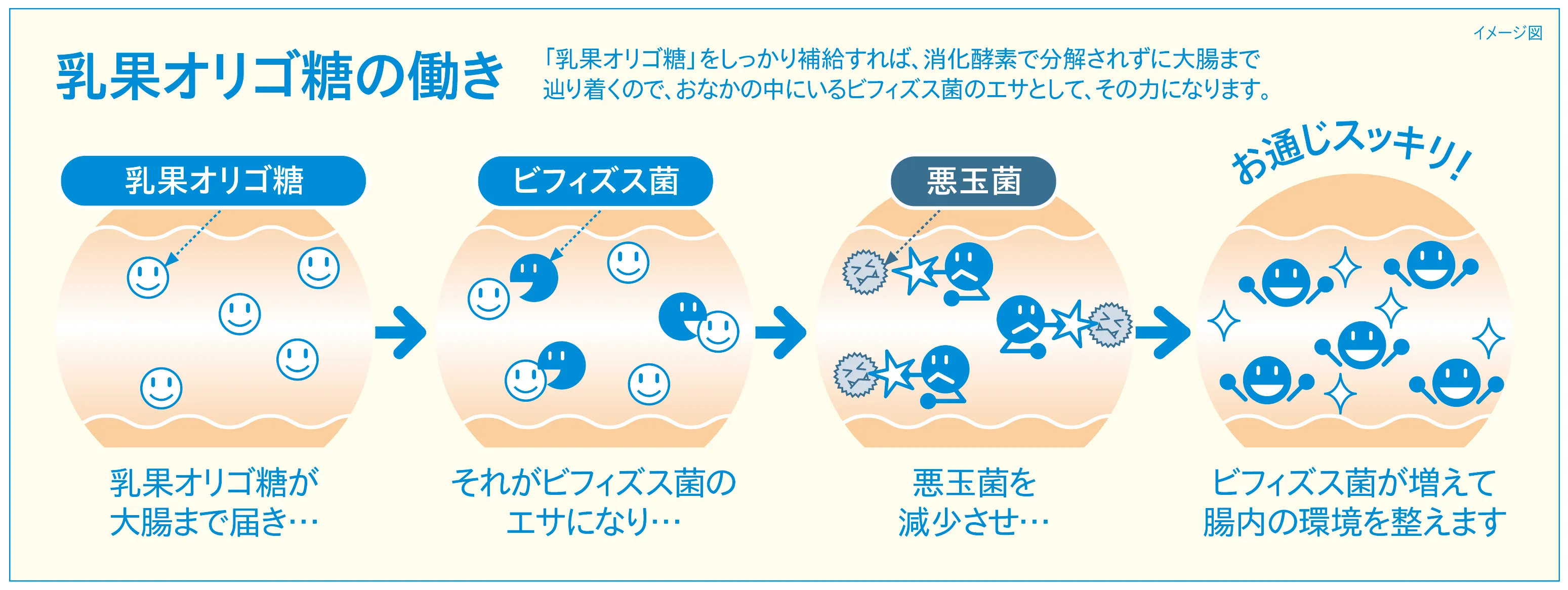 乳果オリゴ糖の働きにより、腸内のビフィズス菌を適正に増やして、おなかの調子を良好に保ち、便通の改善に役立つ飲料です。
