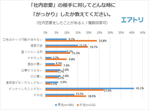 仕事もプライベートも共有する時間が長い場合、お互いの残念なところが見えてもおかしくはないはずですが、男女共に「がっかりしたことがない」が最多で女性は27.0%、男性は41.1%の回答でした。