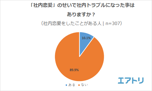社内でトラブルになったことが「ある」と回答した人は10.1%だった一方で、「ない」は89.9%でした。社内恋愛をしている人なりに、私情を仕事に挟まないように見えない努力をしているのかもしれません。