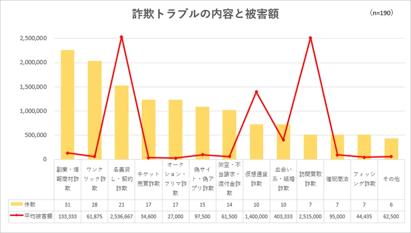 >詐欺トラブル被害で最も多いのは「副業・情報商材詐欺」(31件、平均被害額133,333円)