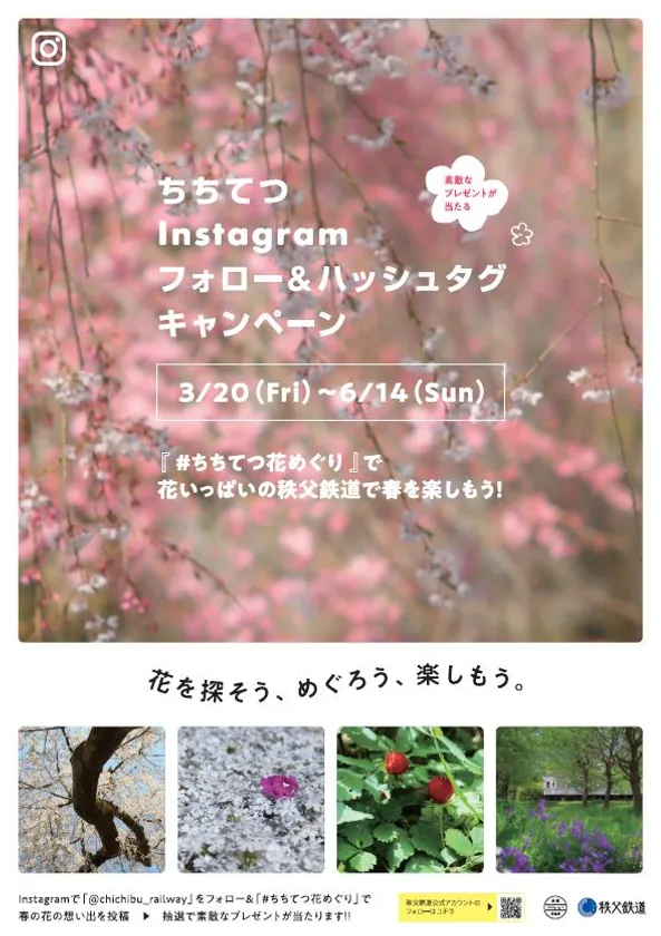 秩父鉄道株式会社(本社:埼玉県熊谷市、代表取締役社長:大谷 隆男)では、世界中で利用されているSNSの一つ「Instagram(インスタグラム)」を活用したキャンペーン企画として「ちちてつ Instagramフォロー&ハッシュタグキャンペーン」を、3月20日(金・祝)~6月14日(日)の期間で開催します。開催期間中に見頃を迎える「芝桜の丘」や「天空のポピー」など秩父鉄道沿線で出会った「春の花」をテーマに投稿を募集し、当選者には、「秩父鉄道沿線地域のお土産&秩父鉄道グッズ」をプレゼントします。詳細は、下記のとおりです。