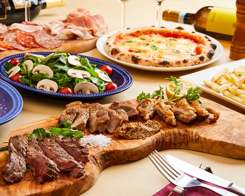 ワインに合うパスタ・ピッツァ・肉料理など、ボリュームたっぷりのイタリアンを各種取り揃え、専用のカッターで切る生ハムは、とろける食感でワインとの相性も抜群。また、イタリア産ワインを30種類以上扱っており、気軽にお楽しみいただける日替わりグラスワインもご用意しています。