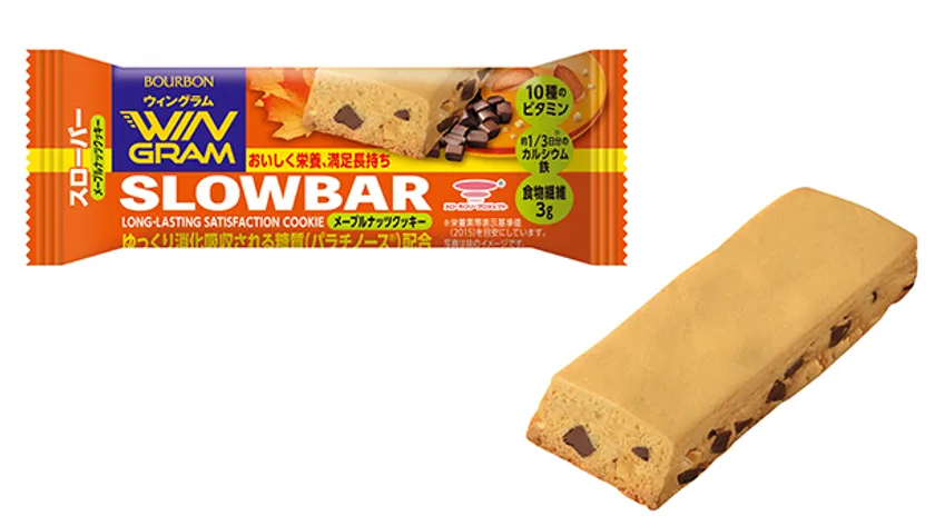 “スローバー”シリーズは、ゆっくり消化吸収される糖質“パラチノース”を配合したバータイプのソフトクッキーで、10種のビタミン、約1/3日分※のカルシウムと鉄分、食物繊維3gを摂取できる栄養調整食品です。新商品の“メープルナッツクッキー”は、メープルシュガーにアーモンドとチョコチップを使用し素材感のある味わいに仕上げました。またリニューアルでは、クッキー生地の甘さを見直したほか、チョコチップのカカオ感をアップし、キレのある味わいとしました。また、忙しい時の食事替わりから、アウトドアの行動食や運動習慣のある方々にも幅広くご利用していただきたいと考え、パッケージに“ウィングラム”ブランドのロゴを掲載しました。