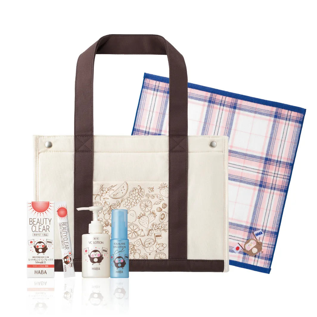 『フク子さん 夏の応援セット』は、美白※1化粧水「薬用VCローション」、クールな使用感の日中用ミストローション「ひんやりスクワランスパローション」、内側から紫外線ダメージ、乾燥、暑さに対応するサプリメント「ビューティーガード」など、ダメージを受けがちな夏の肌と身体をサポート。また、大判のガーゼタオルハンカチ、トートタイプの保冷バッグなど、この時期に大活躍しそうなおすすめの雑貨アイテムも取り揃えました。全アイテムにハーバーLINE公式アカウントキャラクターのフク子さんをデザインし、夏のスポーツ、観戦、レジャーを応援します。