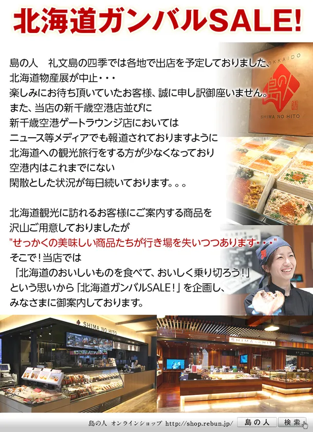 新型コロナウイルスの影響を受け、当社が出展予定でございました各地で人気の北海道物産展が相次いで中止となっております。また、当社が出店している島の人新千歳空港店では、航空機の減便影響もあり、観光客等が大幅に減少し閑散としている状況です。当社並びに各北海道企業も多くの在庫を抱えることとなっております。