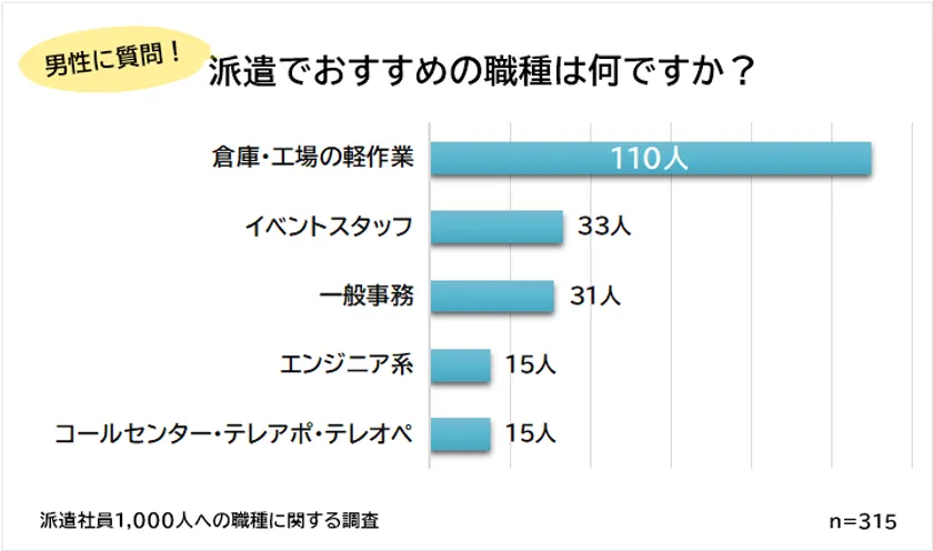 男性が選ぶおすすめの派遣の職種は「倉庫・工場の軽作業(110人)」がダントツ1位、次いで「イベントスタッフ(33人)」でした。
