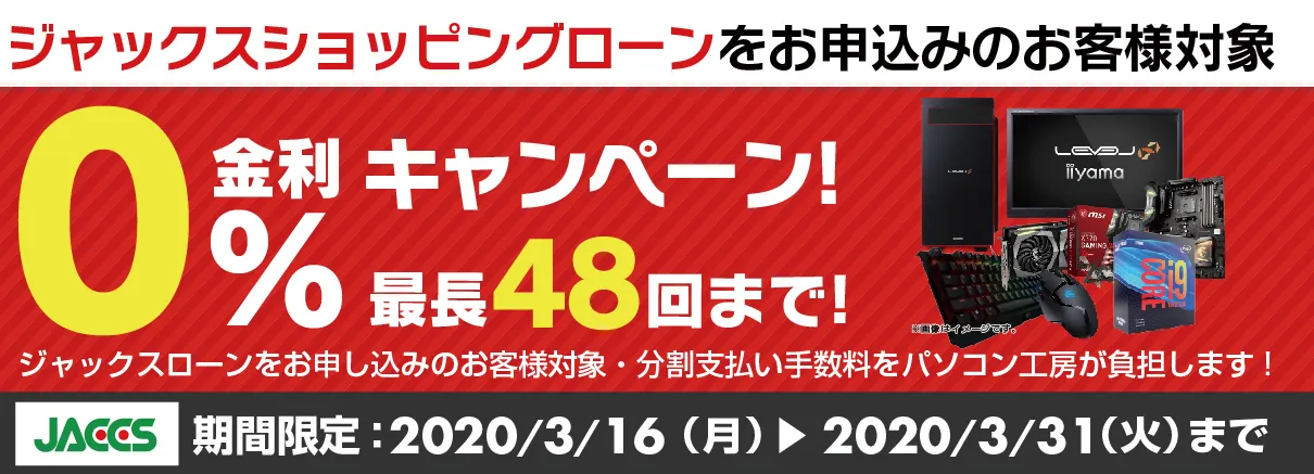 パソコン工房・グッドウィルを運営する株式会社ユニットコム(代表取締役:端田 泰三、本社:大阪市浪速区)は、パソコン工房Webサイトおよび全国のパソコン工房・グッドウィル各店舗にて、ジャックスローンをご利用の場合、分割支払い金利手数料が最長48回まで無料になる『ショッピングローン0%金利キャンペーン』を2020年3月16日(月)より開始しました。