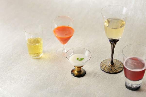 夏涼の重と共に、夏にさっぱりと味わえる飲み物を提供します。例えば一緒に食べる食品の栄養素が破壊されるのを防ぐと言われているお酢(*5)をサイダーで割ったものや飲む点滴とも言われるほど栄養豊富な甘酒(*5)とレモン汁を合わせたもの、果物のジュースなど、全5種類の飲み物を用意します。料理と合わせて少しずつ楽しめるよう1杯あたり2~3口で飲みきれる分量で提供します。