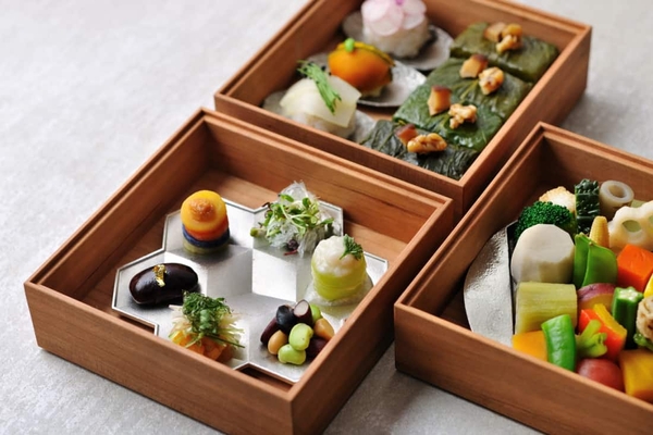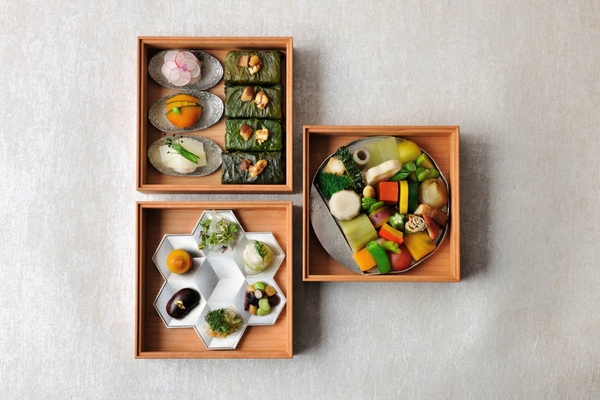 軽井沢は、8月の平均気温が約20.5度と、都内より6度ほど低く、中でも朝は心地よく過ごすことができます(*4)。本朝食は、目の前に棚田の景色が広がる「日本料理 嘉助」のテラス席にて、1日1組限定で提供します。流れ落ちる水音が響き、朝の涼しい風が吹き抜け、その風に乗って群葉の匂いを感じられる席です。また、テラス席からの景色のみならず、料理の見た目からも夏らしさを感じられる仕立てにしました。色彩のはっきりした夏野菜をふんだんに使用し、目にも鮮やかな料理を錫の器に丁寧に盛り付けお重に詰めることで、涼やかな印象を与えます。目の前に広がる緑豊かな夏の情景や心地よい風、色鮮やかな夏野菜と涼やかな器など、五感で涼を感じられます。