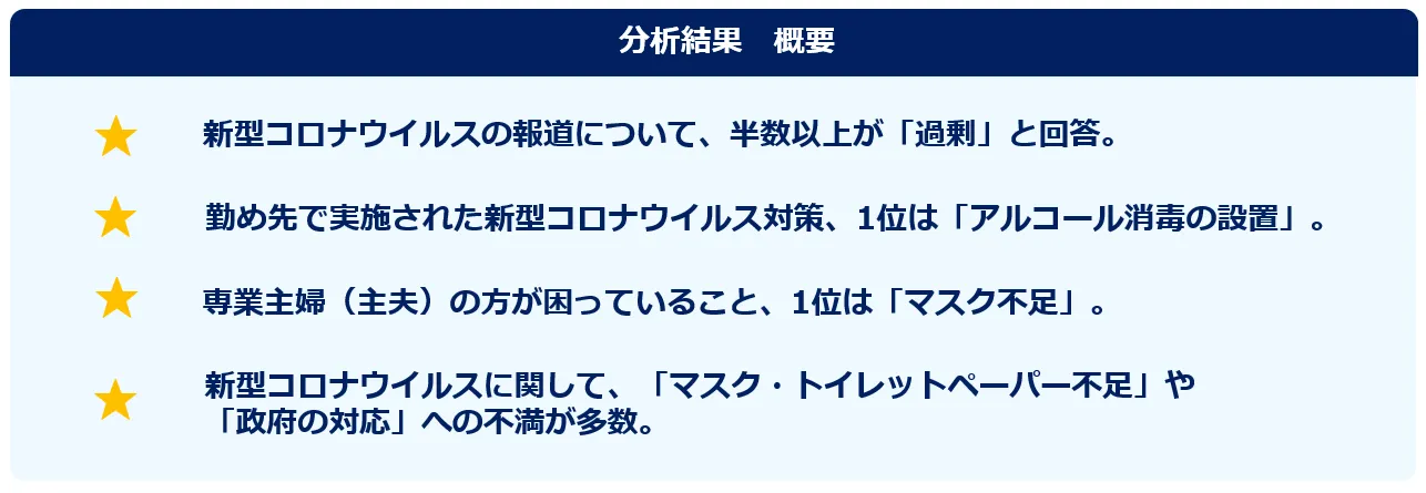 株式会社Insight Tech(本社:東京都新宿区、代表取締役社長:伊藤友博)が運営する「不満買取センター」上で、「新型コロナウイルス」に該当するインサイトデータ2,996件をユーザーから収集。解析ツール「ITAS」で解析を行ないました。以下、結果をご報告いたします。