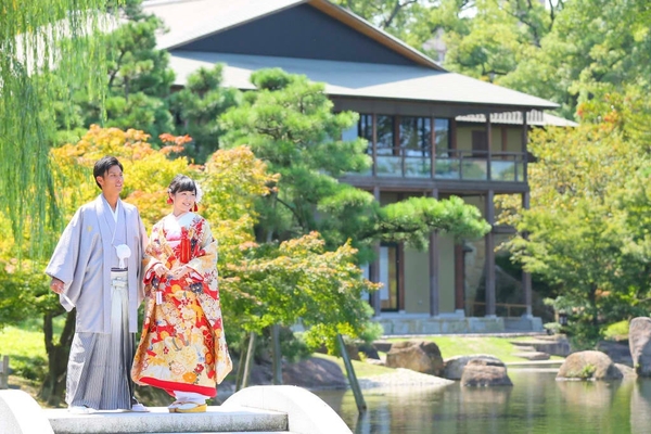 徳川家と縁深い歴史ある日本庭園で撮影できる、和装ロケーションの人気プラン。池にかかる橋や日本家屋、四季折々の自然が伝統的な婚礼衣装によく合います。