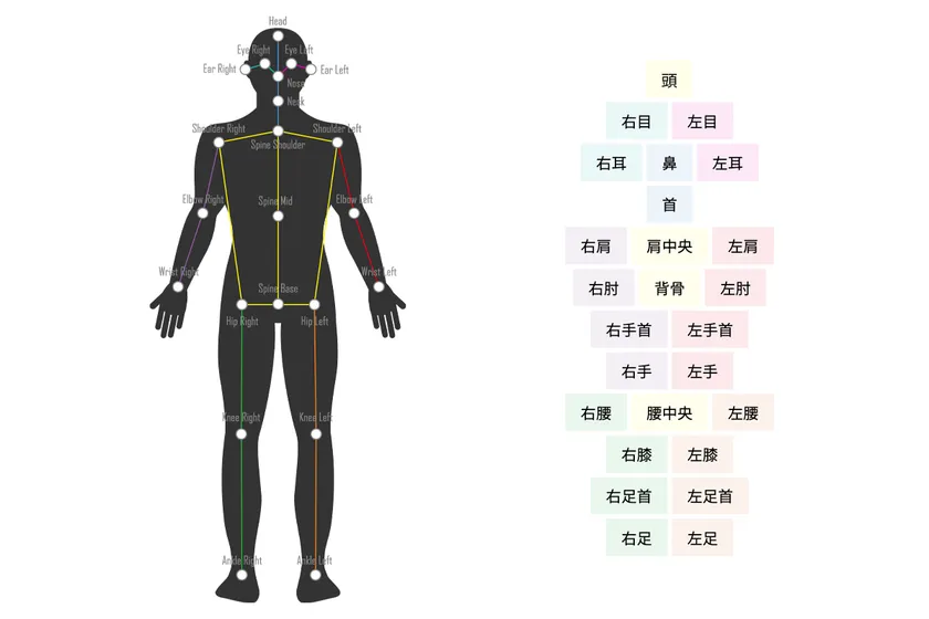 VisionPose Nano『高速化BodyAndColor(β)』で取得できる2D座標(22箇所)
