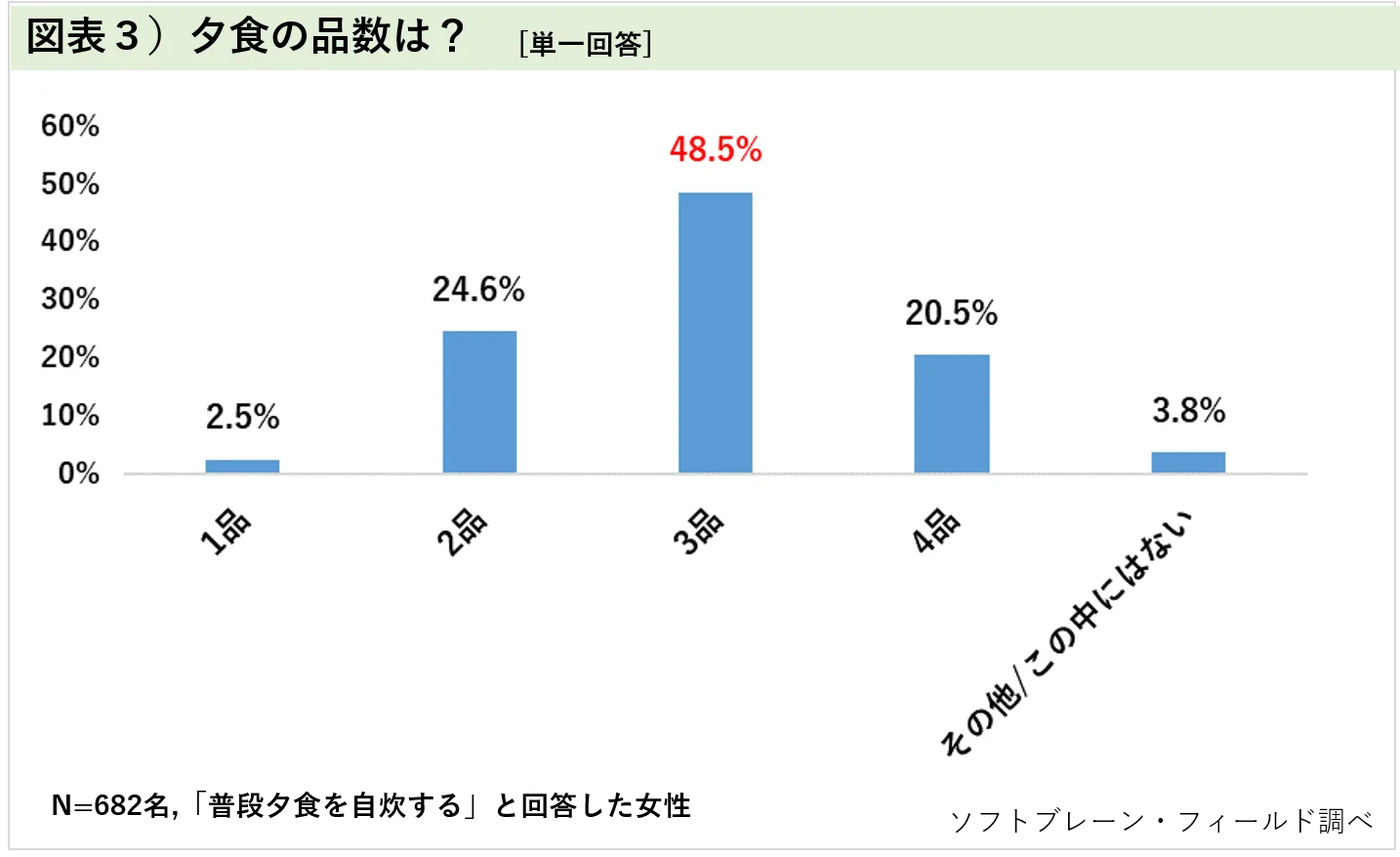夕食の品数(ご飯は含まない)は、「3品(48.5%)」が最多となり、「2品(24.6%)」、「4品(20.5%)」と続きます。忙しい中でも汁物やおかずなどを2~3品組み合わせた献立を意識していることがわかります。