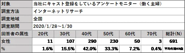 フィールド・クラウドソーシング事業を展開するソフトブレーン・フィールド株式会社(本社東京都港区、代表取締役社長:木名瀬博)では、働く女性の「夕食の調理」に関するアンケートを実施しました。アンケートの対象は、当社に登録するキャスト会員691名(平均年齢48歳)で、実施期間は2020年1月28日~1月30日です。