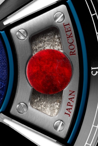 3時位置のアルミ製カプセルに、赤くワニス加工を施した丸形の月の隕石を配しています。これは、月面から引き裂かれたのち、40万kmの旅の末にオマーンのドファール砂漠に落下したもので、世界で300個程度しか記録されていない希少な隕石です。