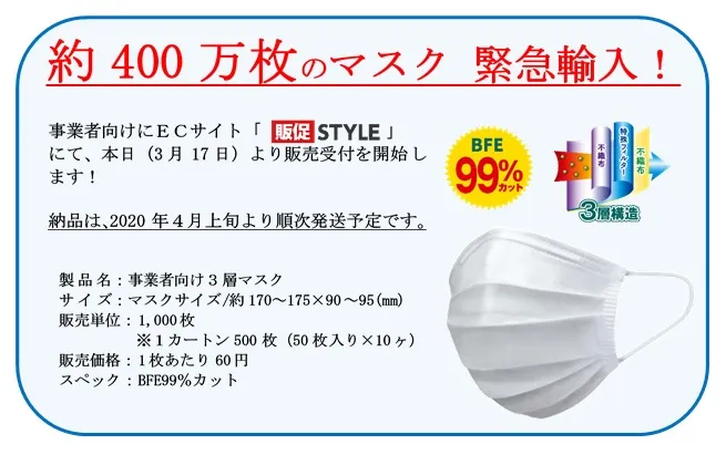 当社グループでは、マスクの生産及び供給体制の再構築を行い、事業者向けに約400万枚のマスクを緊急輸入し、4月上旬より販売することといたしました。