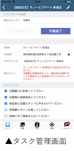 フィールドスタッフ向けタスク管理システムをルート配送向けに最適化。配送情報をスマートフォンに集約し作業をチェックリスト化することで、ミスの防止につながります。配送先ごとの細かい情報やノウハウなども登録できるため、全ての配送担当者が同じ情報を共有することで配送品質の均一化に貢献します。また、作業の進行状況は本部の管理画面でステータスごとに色分けされます。これにより、誰がどんなルートで配送を行っているかが可視化されるので、追加配送など急な対応が必要な時も、適切・迅速に指示を出すことが可能です。