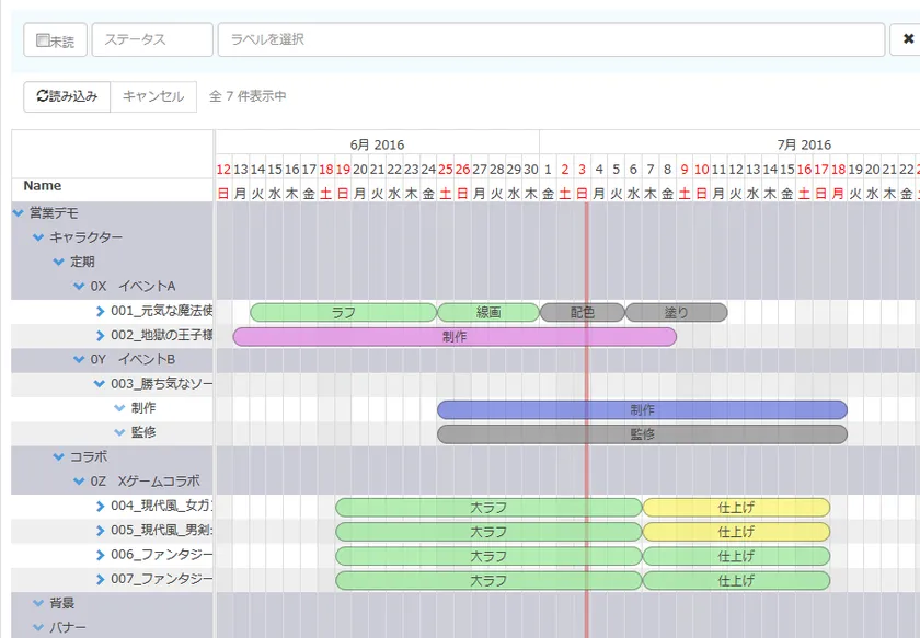 プロジェクト全体の進捗状況を俯瞰して確認できる機能です。詳細を閲覧する時には該当のスレッドにこの画面からワンクリックで遷移できます。