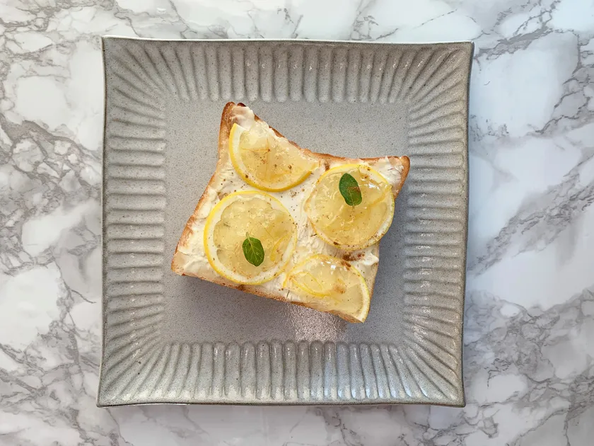 1. 「生」食パンをトーストしてクリームチーズを塗り、レモンの薄切りをのせます。
