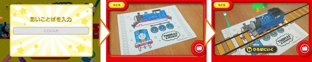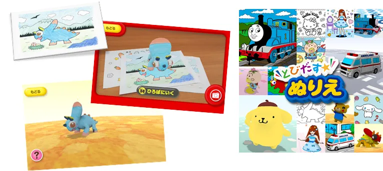 ・3Dカメラ: AR技術を活用したデジタルならではの新感覚ぬり絵です。専用の台紙を印刷してクレヨン等で彩色しスマートフォンなどのカメラで取り込むと、お子さまが塗ったぬり絵が色や質感もそのままに3Dとなって飛び出し、画面の中で動き回ります。