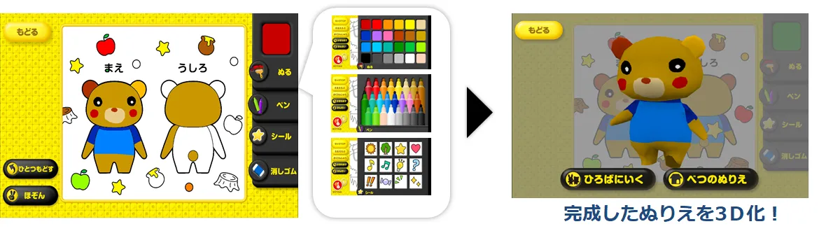 ・ゆびでペイント: アプリ上でペンなどのツールを使って楽しめるデジタル版のぬり絵です。完成したぬり絵は、塗った色や描いた線をそのまま反映した3Dモデルとして、コレクションしたり動かして遊ぶことが出来ます。