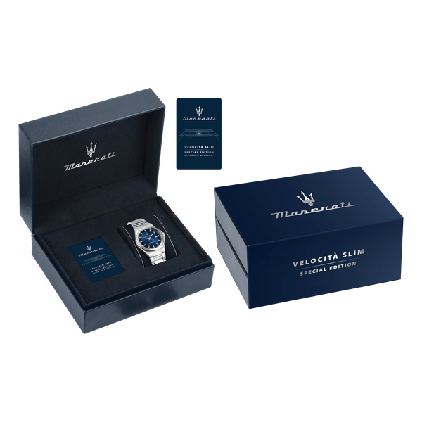 デザインの核は「軽やかさ」。自動巻モデルは厚さ10.7mm、クロノグラフは9.9mm、3針モデルはわずか7.8mmとスリムなフォルムを実現。軽量化により快適な装着感と携帯性を備えつつ、美しさと機能性も妥協していません。ステンレススチールケースは立体的なダイヤルを包み、中央でマセラティの象徴「トライデント(Trident)」が輝きます。スクリュー式リューズやケースバック、精緻なベゼルなど細部に至るまで上質を追求。「Velocità Slim」は、大胆さとモダンデザインを融合させ、イタリアの美学と情熱を刻むタイムピースです。
