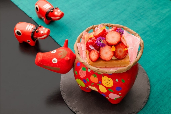 スイーツは2品提供します。はじめに5種のミニャルディーズ(一口サイズの菓子)を提供します。福島の銘菓やあんぽ柿(*2)などの地域で親しまれている味を洋菓子としてアレンジした一品です。器は、「会津三縁起」のひとつとして地域に親しまれている「かざぐるま」の羽をイメージしたものです。次にメインとして「季節のフルーツタルト」が提供されます。器は赤べこがタルトを背負っているように見えるフォトジェニックな形で、見た目も楽しい一品です。