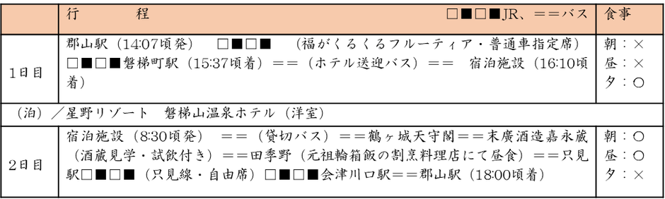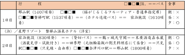 運行区間:磐梯町駅 11:10頃発→郡山駅 12:50頃着、郡山駅14:07頃発→磐梯町駅 15:37頃着